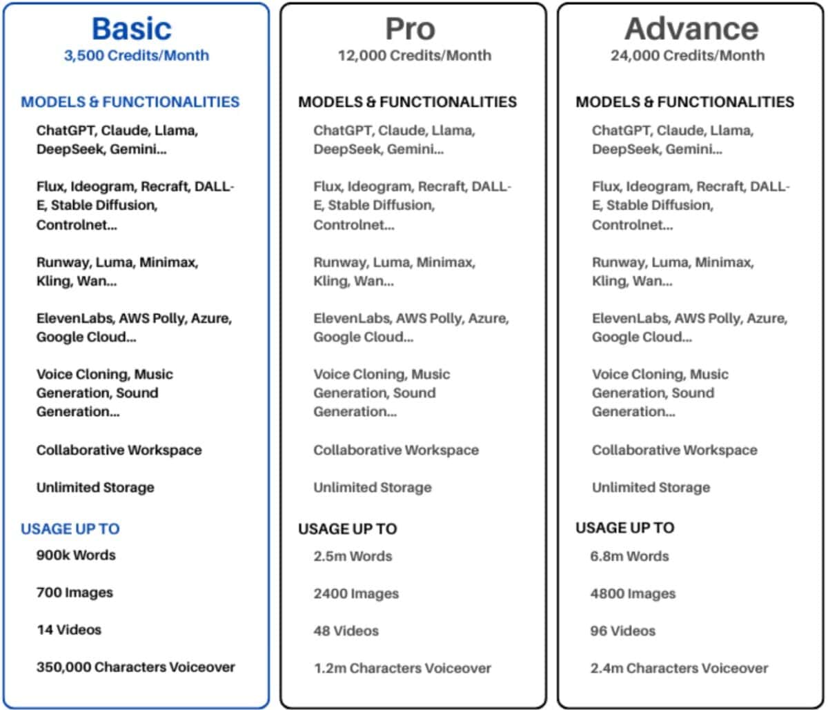 - Usage limits: up to 2,500,000 words, 2,400 images, 48 videos, 1,200,000 characters voiceover