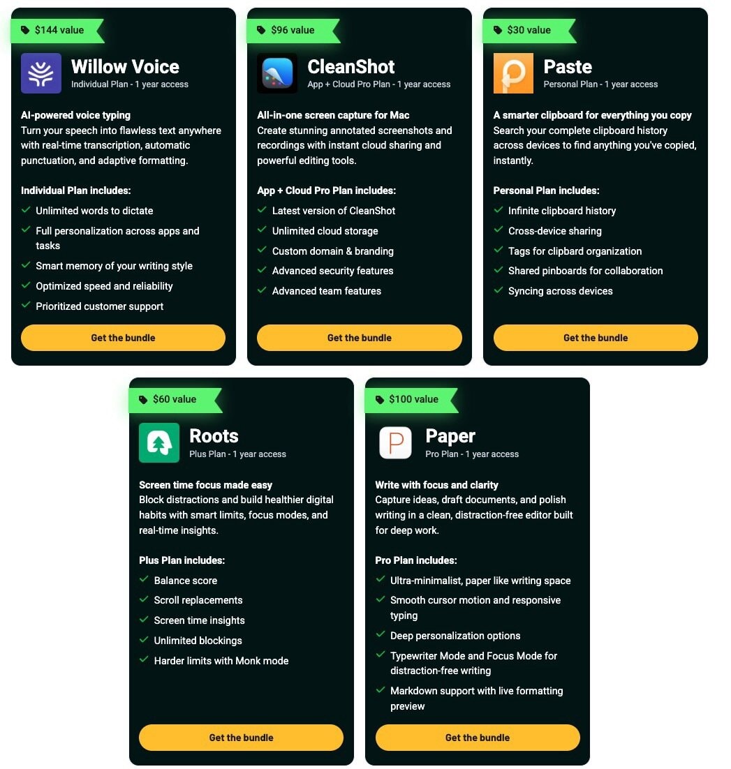 - Platform availability: Mac (Willow Voice, CleanShot, Paper, Paste) and iOS (Paste and Roots) only