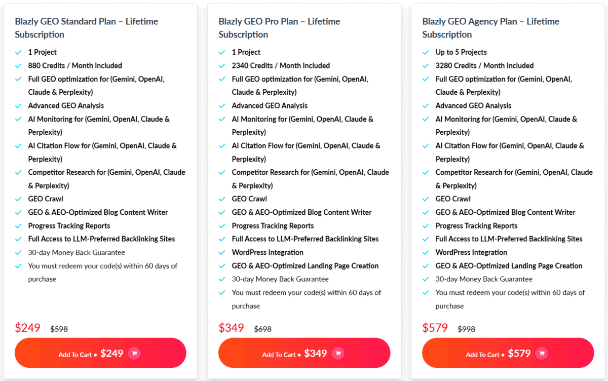🥉 Get Blazly GEO Agency Plan Lifetime Deal for $579 with everything above +