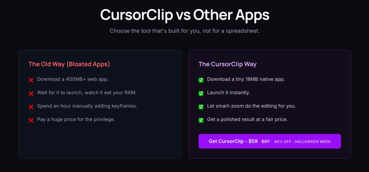 CursorClip is a native macOS screen recorder that captures screen, system audio and microphone while automatically applying cinematic zoom and pan that follows the cursor. It includes webcam recording, custom backgrounds, and a lightweight video editor to add, remove or fine-tune zoom points and export high-quality MP4/MOV or GIF files up to 4K. The app is around 18 MB, launches in under two seconds, and is built for macOS 12+ on Apple Silicon and Intel machines, keeping resource usage minimal for a snappy experience.