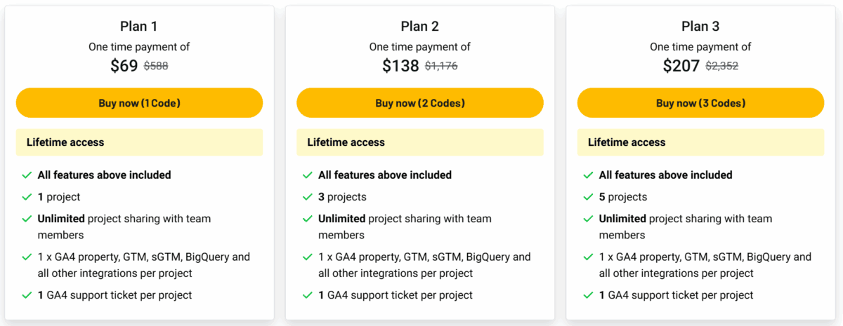 - 1 x GA4 property, GTM, sGTM, BigQuery, and all other integrations per project