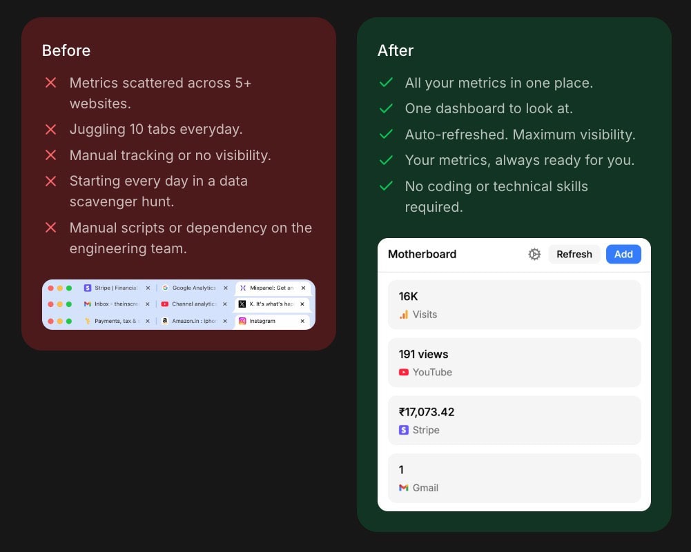 - Track metrics from any website (public, private, or behind login) by clicking any value on the page