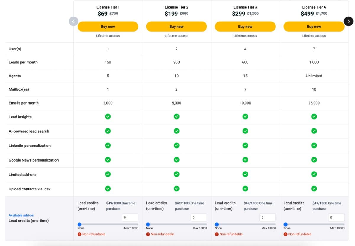 - Available add-on: Lead credits (one-time) at $49/1000, max 10,000, non-refundable