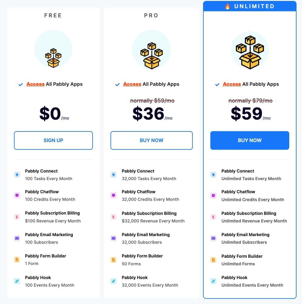 - Included within Access All Pabbly Apps plan (normally $79/mo, currently $59/mo): Pabbly Connect (unlimited tasks every month), Pabbly Chatflow (unlimited credits every month), Pabbly Subscription Billing (unlimited revenue every month), Pabbly Email Marketing (unlimited subscribers), Pabbly Form Builder (unlimited forms)