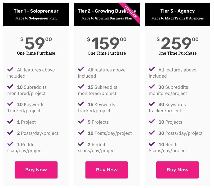 - Unlimited replies per day per project, Opportunity Finder, Authentic Response Assistant, Ban Proof Post Creator, Priority Support