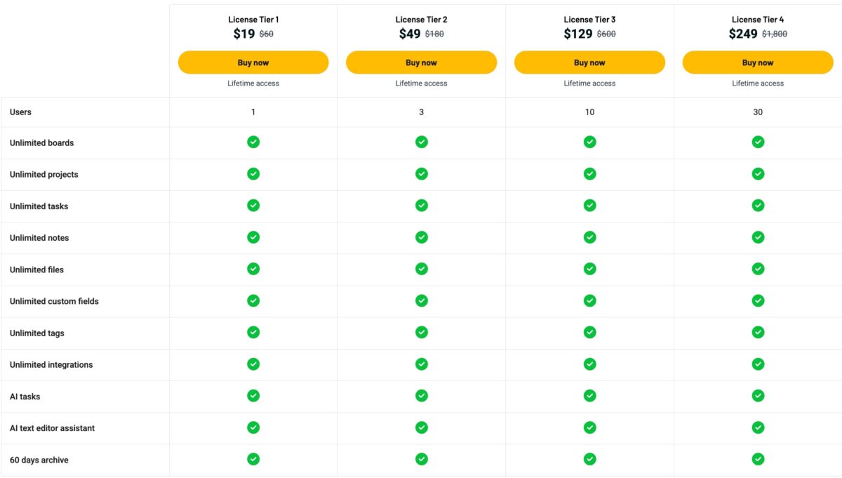 - Unlimited boards, projects, tasks, notes, files, custom fields, tags, integrations