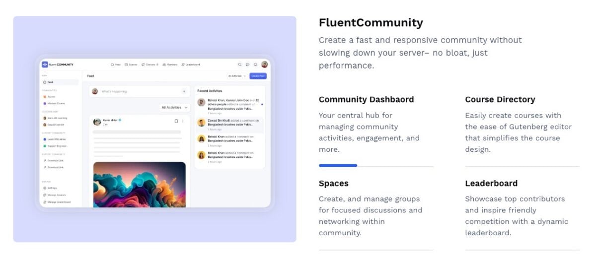 FluentCommunity is a WordPress plugin that enables organizations to create fast, responsive online communities and course-driven experiences without heavy server load. It provides user profiles, feeds, discussion threads, private messaging, content sharing, directories, notifications, and LMS features so site owners can host discussions, courses, and member interactions directly on their WordPress site.